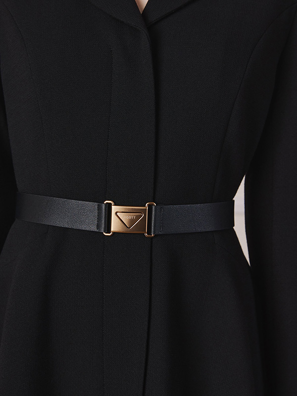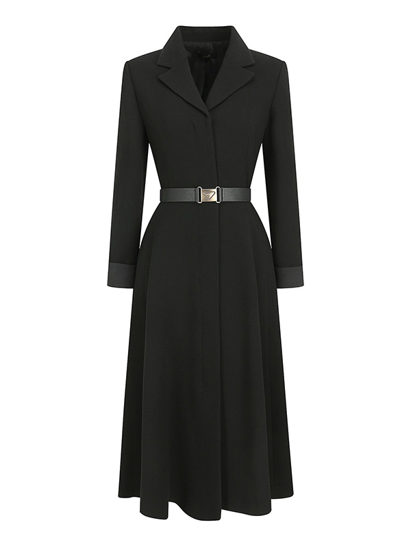 • 广州服装制造工厂直供黑色西装领收腰连衣裙,采用挺括面料塑造立体版型,西装领设计干练大气,腰带收腰凸显身材曲线,大摆裙型增添优雅感。